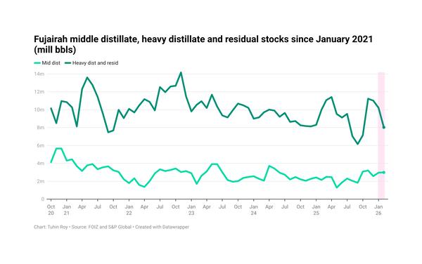 In the nearby Sohar port in Oman, bunker operations have largely remained unaffected by bad weather conditions, a trader says. There may be some delays, but bunkering so far has not been suspended in the port, the trader adds.