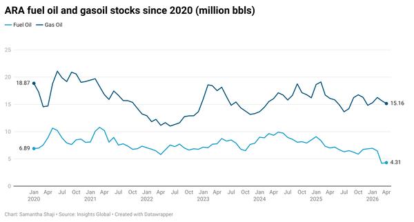 The ARA’s independently held fuel oil stocks averaged 2% higher in October than across September, according to Insights Global data.