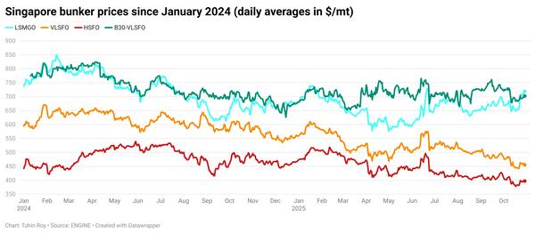 Despite low bunker demand in Singapore, lead times for VLSFO have increased from 5–14 days last week, to 9–17 days now due to limited barge availability, according to a source.