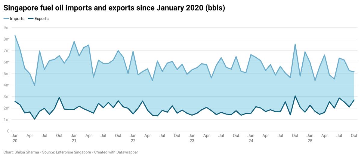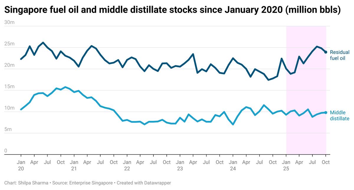 Singapore’s residual fuel oil stocks have averaged 4% lower so far in October than across September, Enterprise Singapore’s latest data shows.