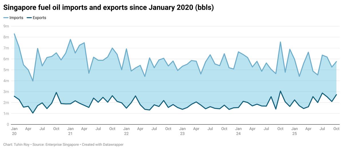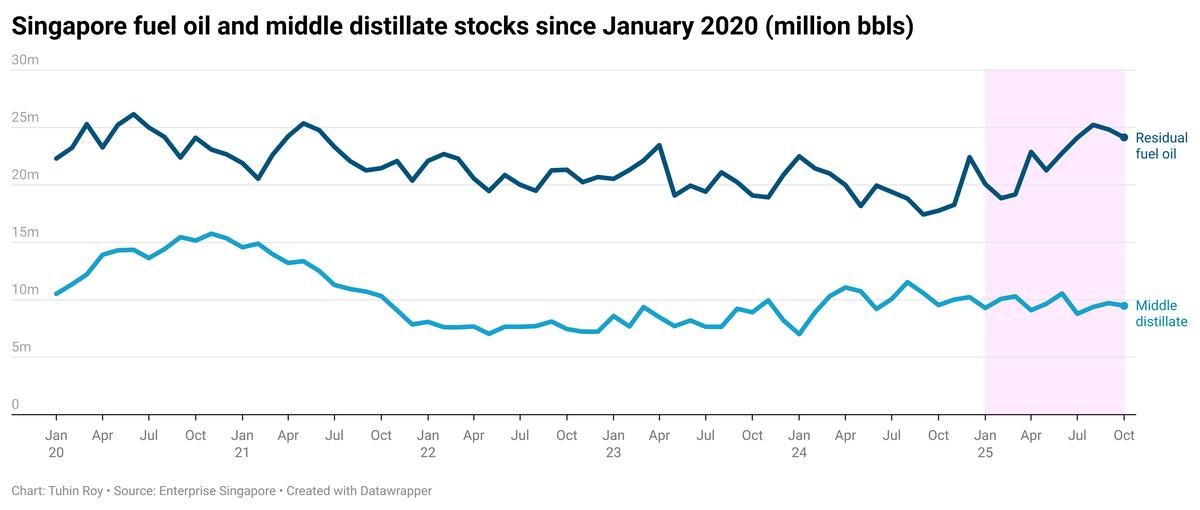 Residual fuel oil stocks in Singapore averaged 3% lower in October than in September, data from Enterprise Singapore shows.