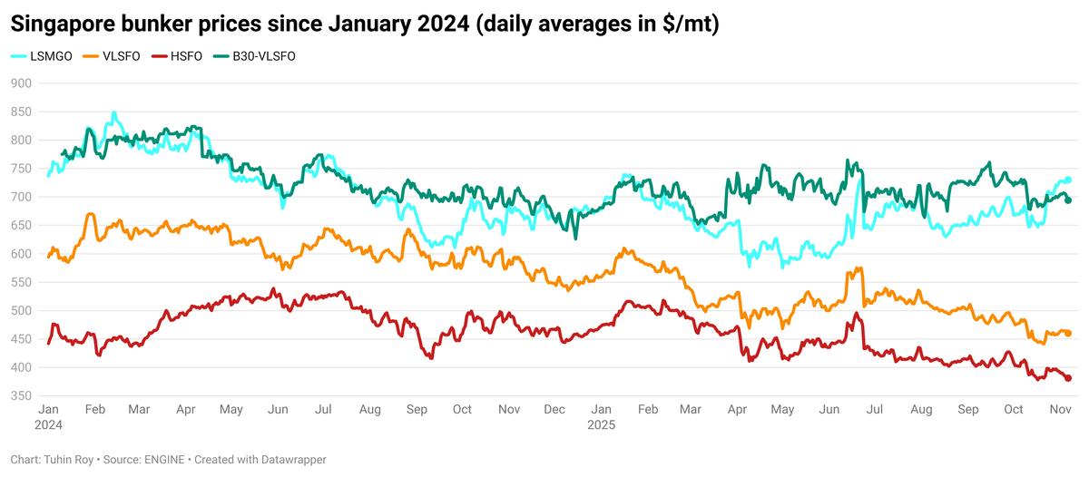 Singapore’s LSMGO price rises, VLSFO, B30-VLSFO and HSFO fall