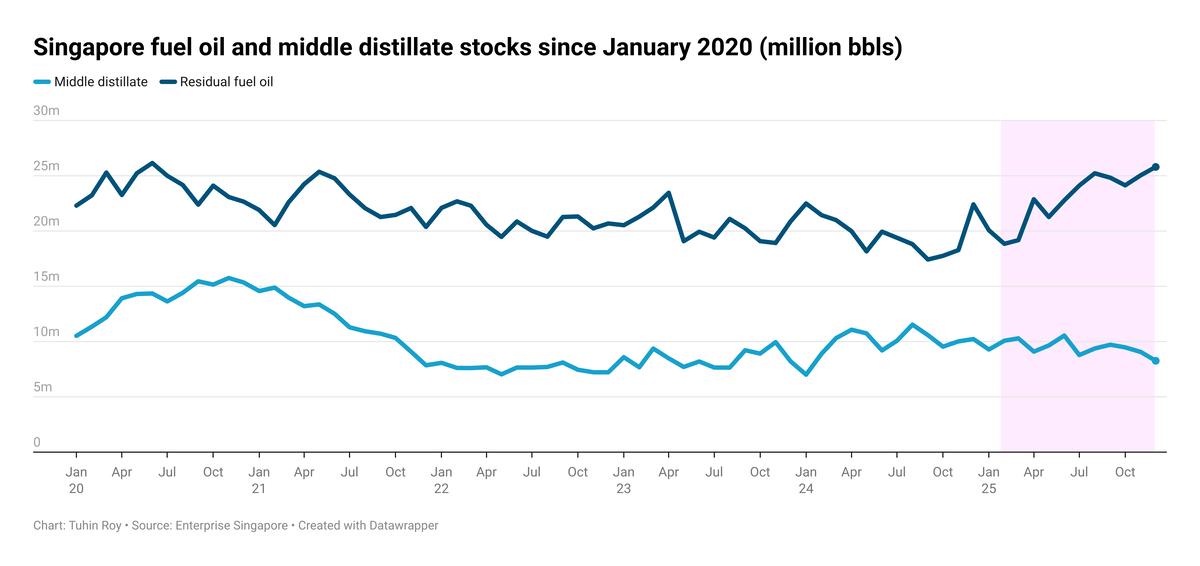 Singapore’s residual fuel oil stocks averaged 3% higher in December than across November, according to Enterprise Singapore.