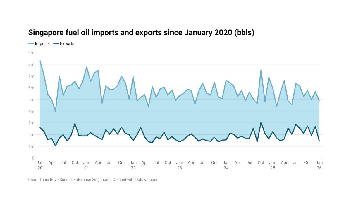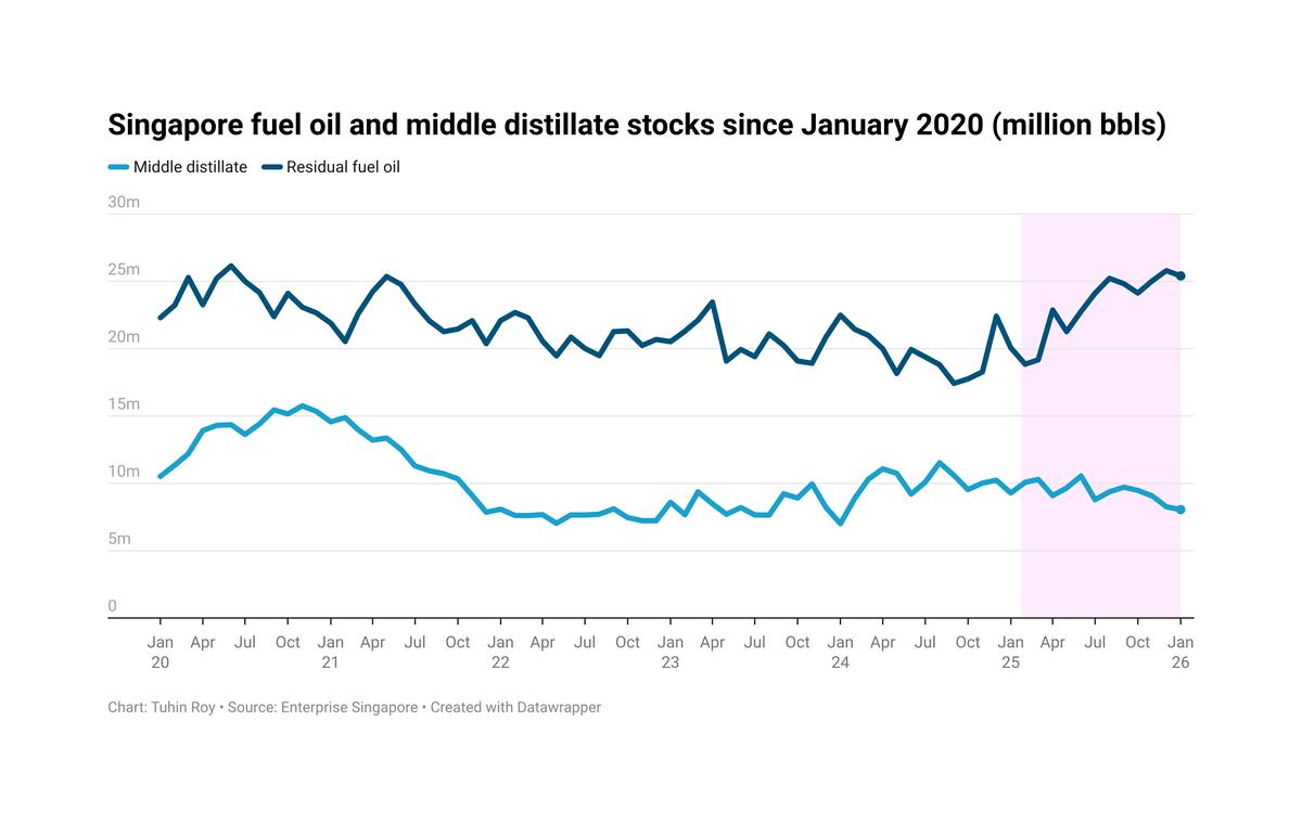 Singapore’s fuel oil inventories have stayed above 25 million bbls, amid a 14% rise in net fuel oil imports so far in January. However, both imports and exports have declined, with imports down by 814,000 bbls and exports falling by a larger 1.24 million bbls.