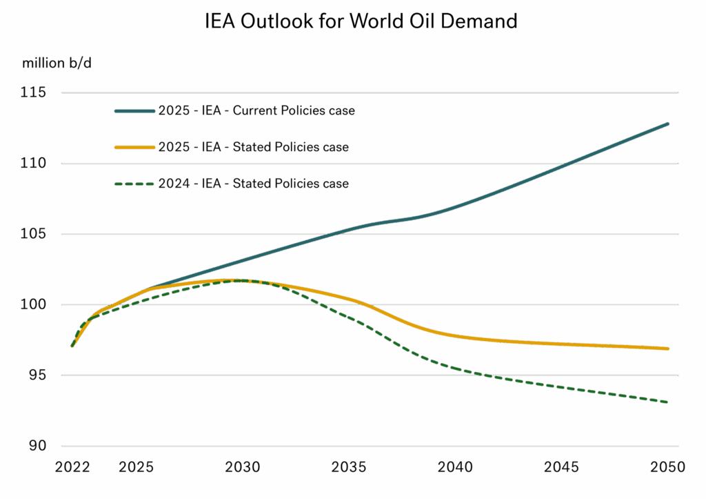 The graph below illustrates the ‘Stated Policies’ outlook for world oil demand as shown in last year’s report (2024 IEA Stated Policies case). This was the highest level of oil demand of their three cases back in 2024, and showed a world where ‘peak oil’ was reached in the early 2030s.