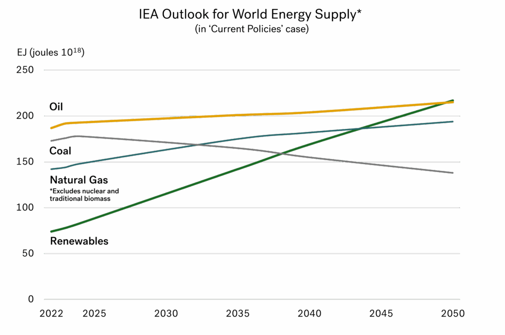 Even though the IEA has developed a scenario where oil (and natural gas) demand continues to grow, these increases are very modest in terms of the energy demand projections. So, although the pace of growth in renewables is not as fast as in last year’s scenarios, they still account for the vast majority of incremental energy demand through to 2050.