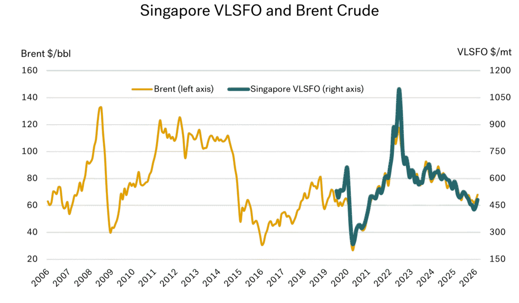 The graph below illustrates the long-run, 20-year history of average monthly Brent crude oil prices, along with prices for Singapore VLSFO as introduced in late 2019. As we have covered in many of our previous reports, VLSFO prices do ultimately track crude prices.