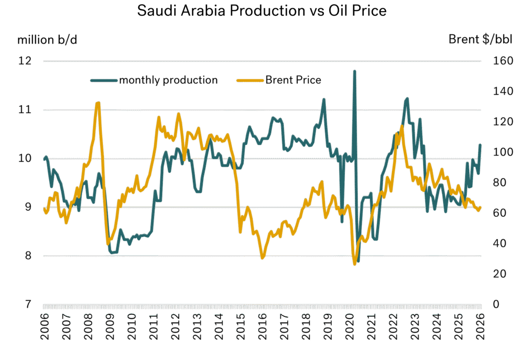 The core OPEC decision-making process has often been between the strong alliance of Saudi Arabia, UAE, and Kuwait. More recently, other producing countries have aligned themselves to OPEC, forming the OPEC+ group. For simplicity, this report focuses on Saudi Arabia’s response — as the most influential member of OPEC — rather than on the collective group.